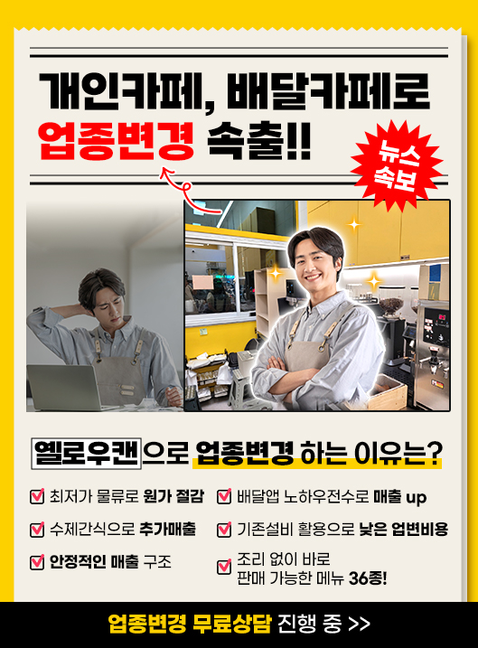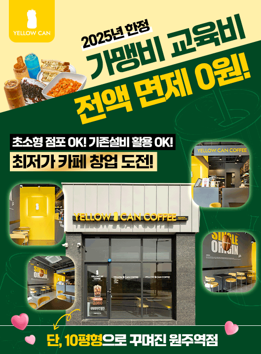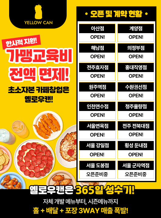 가맹문의 쇄도! 성원에 보답하여 옐로우캔 오픈 프로모션을 진행 중입니다. 30호점 까지 선착순으로 진행 중! 서둘러주세요!